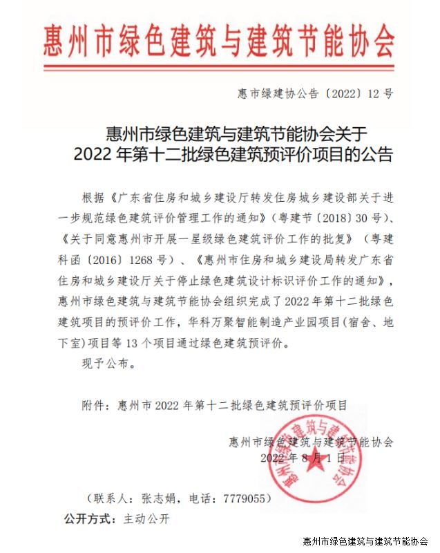【公告】惠州市绿色建筑与建筑节能协会关于2022年第十二批绿色建筑预评价项目的公告