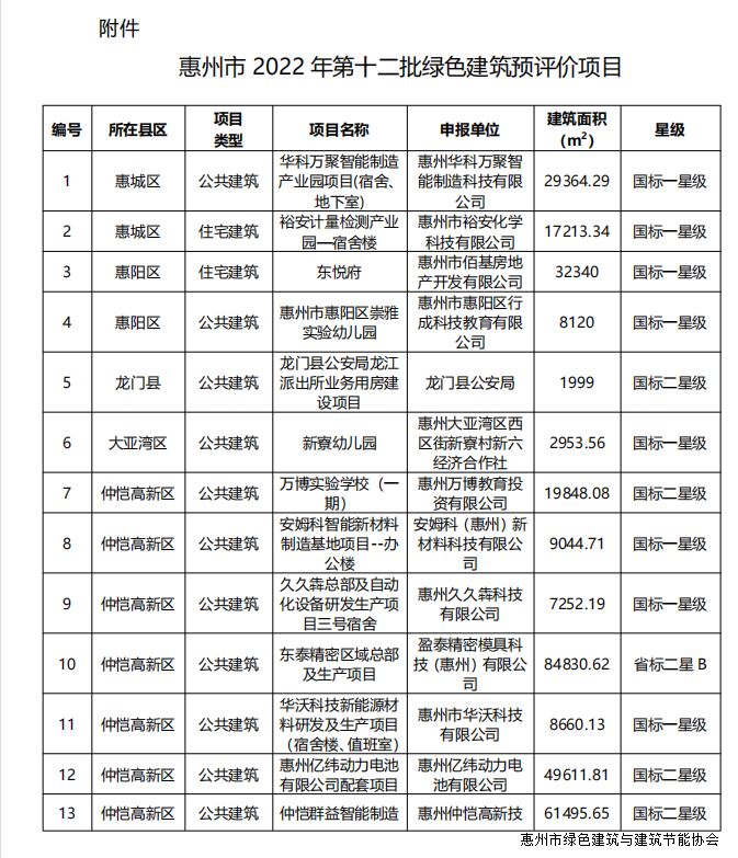 附件:惠州市绿色建筑与建筑节能协会关于2022年第十二批绿色建筑预评价项目的公告