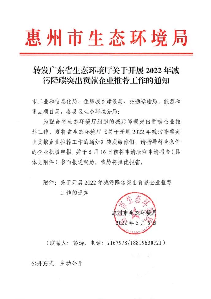 转发广东省生态环境厅关于开展2022年减污降碳突出贡献企业推荐工作的通知
