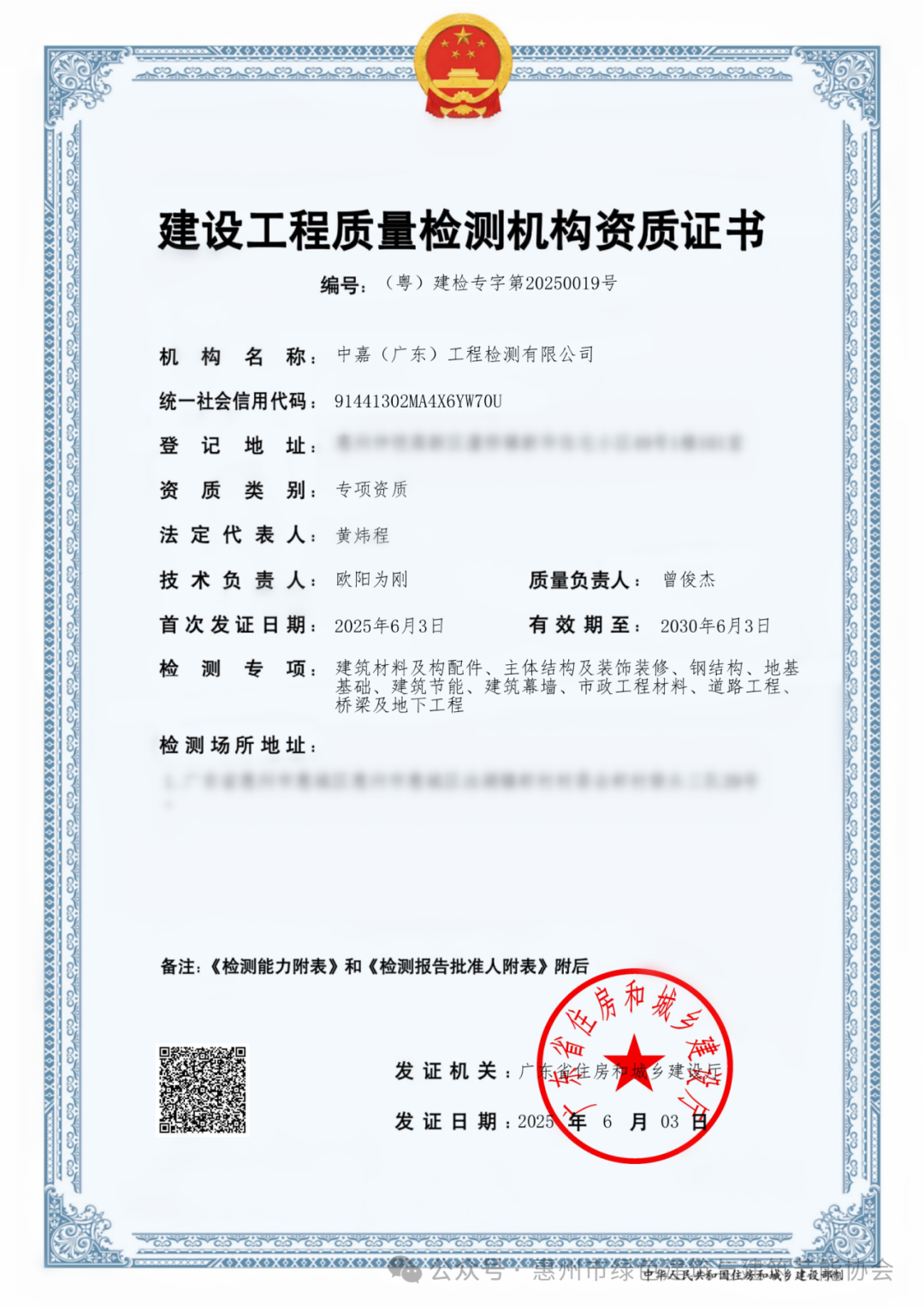 惠州首家!协会理事单位-中嘉检测荣获建设工程九大全项检测资质证书