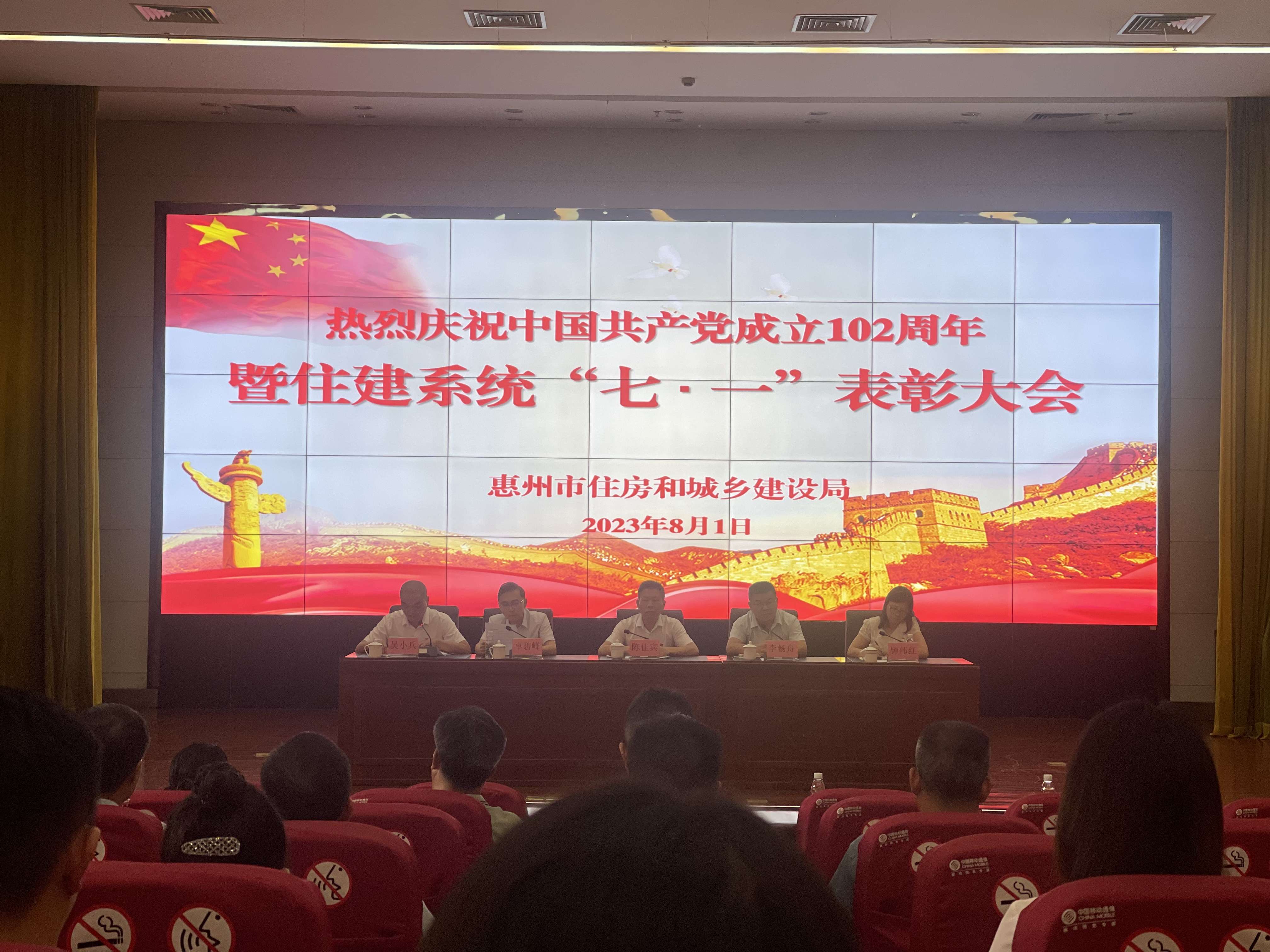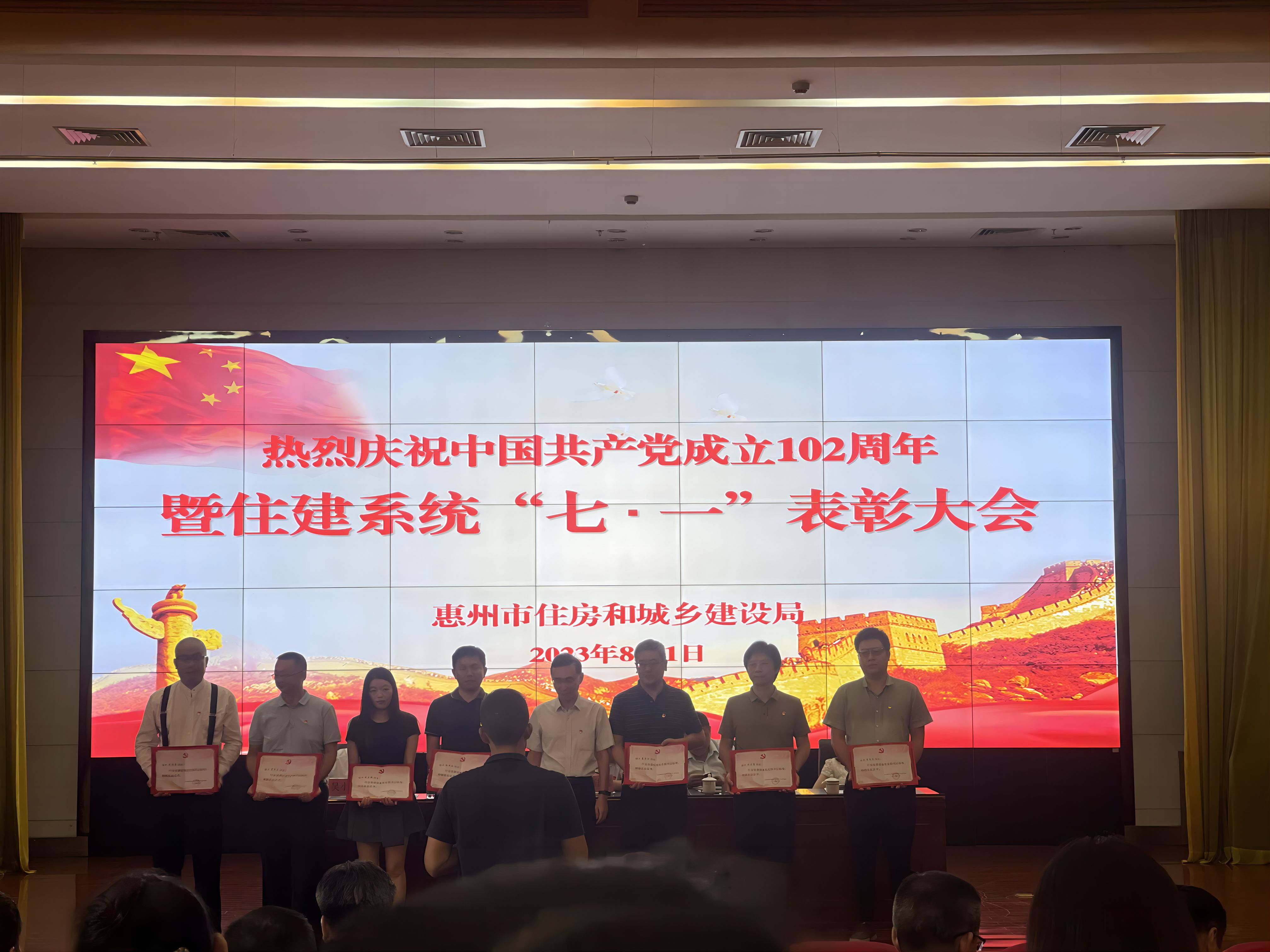 2023年8月1日下午,惠州市建筑和房地产行业党委在市住建局三楼大会议室召开庆祝建党102周年暨住建系统“七一”表彰大会,对2022年度先进基层党组织书记、优秀党务工作、优秀共产党员进行表彰。