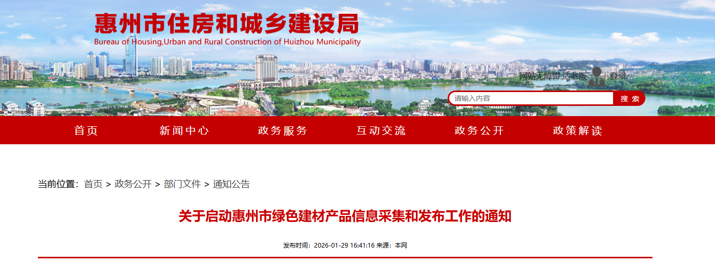 为深入贯彻落实党的二十大和二十届历次全会精神,推动城乡建设绿色发展,根据《惠州市政府采购支持绿色建材促进建筑品质提升政策实施方案》(惠财采购〔2025〕3号)、《惠州市住房和城乡建设局关于发布〈惠州市绿色低碳建材新技术与产品推广目录〉的通知》(惠市住建函〔2025〕571号)等文件要求,推动绿色建材在我市建筑工程中的广泛应用,促进我市建筑工程品质提升,现决定开展惠州市绿色建材产品信息采集发布工作,有关事项通知如下: