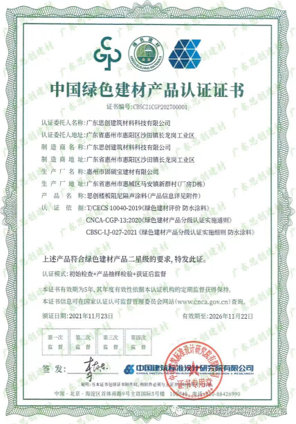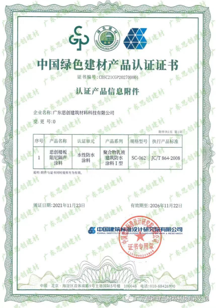 通过专家工厂检查,产品抽样、现场资料审核等流程,思创楼板阻尼隔声涂料在2021年11月取得标准院颁发的中国绿色建材产品二星级认证证书,成为惠州首批获得绿色建材产品认证企业之一。