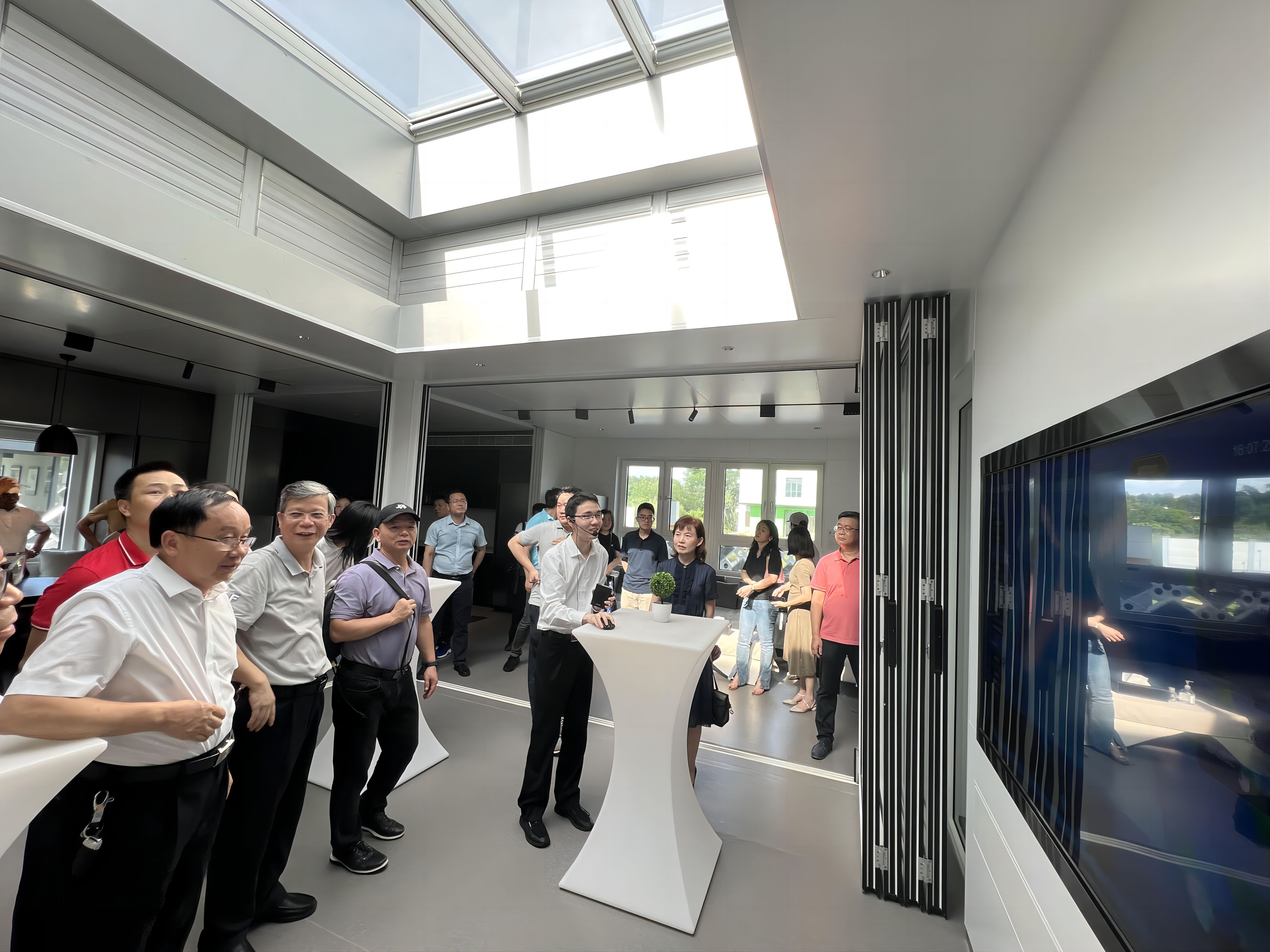 随后,观摩团集体参观了Xhouse,该项目是中建科工与华南理工大学联合研发的夏热冬暖地区零能耗住宅,是2021国际太阳能十项全能竞赛参赛作品,向世界展示了我国在绿色可持续建筑领域的创新探索。X-House由四个相同大小的模块组合成客厅、厨房、卧室以及设备间,这些模块在功能和层数上还可以自由组合,实现标准化和个性化兼顾。有效体现了模块化建筑可装、可拆、可拓展的优点。